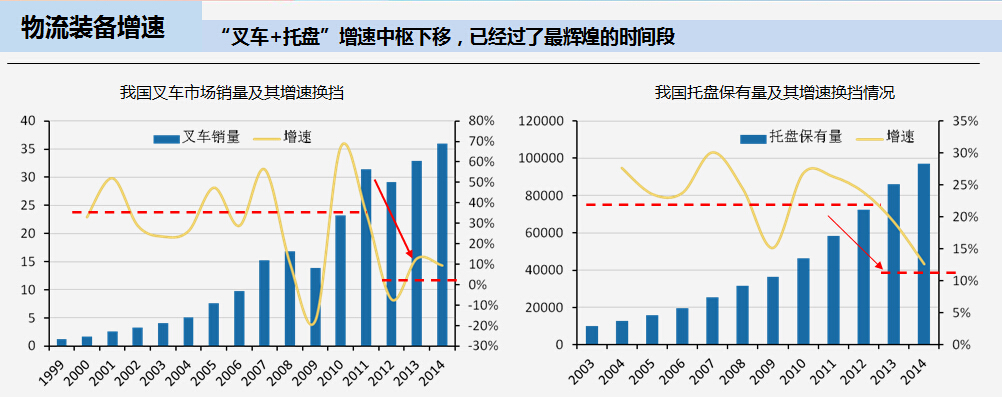 1、叉車市場和托盤市場從2010年后增速經歷換擋期,增速中樞下滑明顯。屬于“叉車+托盤”的時代過去了