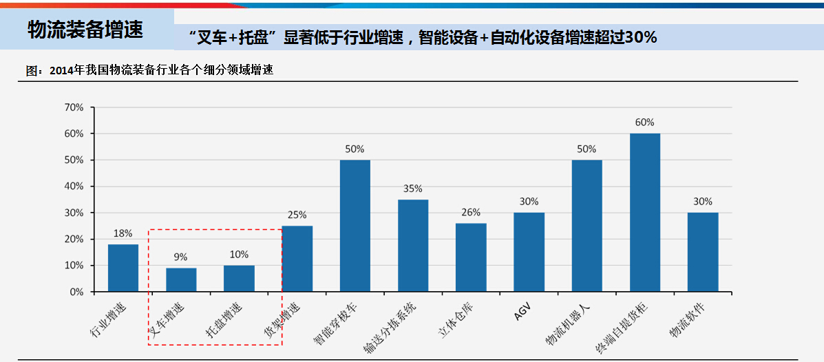 在智能物流裝備所有的子版塊中,叉車和托盤的增速大約在10%左右,低于行業平均增速10個百分點。其他智能化設備,包括智能穿梭車、立體倉庫、AGV、物流機器人、揀選系統、軟件等,增速都在30%以上。