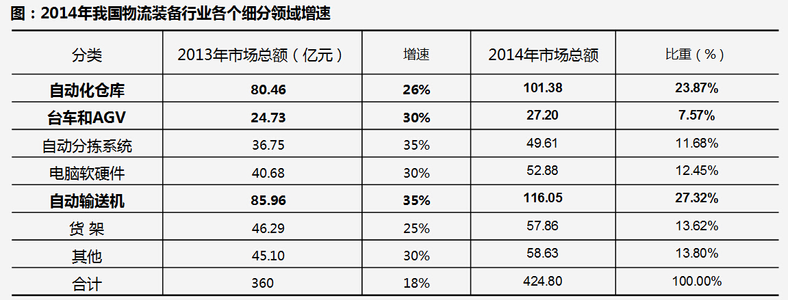 對物流裝備行業進行分解后發現,自動化倉庫占物流裝備的比重達到了24%,自動輸送機的占比達到27%,貨架是14%,分揀設備和軟件均為12%左右。在設備中,AGV雖然只是占比比較小的輸送裝備,但是卻是智能化非常關鍵部件,增速仍然較高。