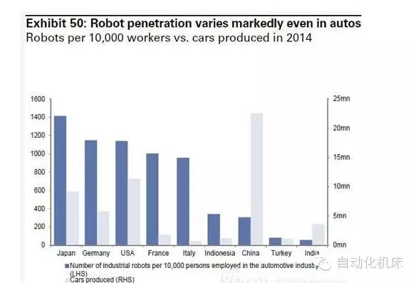 高盛今年3月份走訪了中日26家工廠后,感嘆中國新工廠自動(dòng)化程度之高全球領(lǐng)先。但有先進(jìn)范例的同時(shí),也不能忽視中國目前整體自動(dòng)化水平較低。該機(jī)構(gòu)同時(shí)指出自動(dòng)化并不是程度越高越好,自動(dòng)化程度過高反而可能損害生產(chǎn)效率。