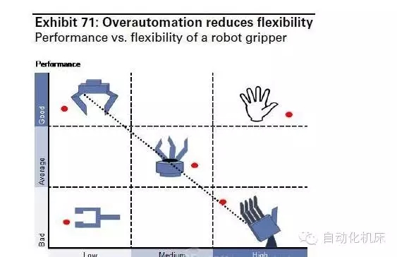 此外,高盛還指出,自動(dòng)化并不是進(jìn)度越快越好,自動(dòng)化程度過高反而可能損害生產(chǎn)效率:根據(jù)國際工程協(xié)會(huì)對(duì)大眾汽車自動(dòng)化戰(zhàn)略的一份報(bào)告,在高爾夫A5汽車德國一條生產(chǎn)線上的某些環(huán)節(jié)中,限制一些自動(dòng)化的使用,增加人工反而利于提升效率。因?yàn)椋詣?dòng)化設(shè)備太多就需要增加人手來維護(hù)這些設(shè)備,這會(huì)抵消原來節(jié)約下的成本。此外研究還發(fā)現(xiàn),在某些環(huán)節(jié),熟練工人的瑕疵率低高于機(jī)器人,因?yàn)楦叨葟?fù)雜的自動(dòng)化系統(tǒng)出問題的幾率也大。即使在新興市場國家,比如中國,過度自動(dòng)化也可能有損生產(chǎn)效率,因國內(nèi)集成生產(chǎn)系統(tǒng)尚不成熟,且缺乏合格的維修人員。