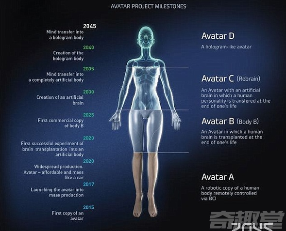 Itskov 表示,對死亡的恐懼讓我決定開始這項計劃,我的終極目標(biāo)是把人的性格完完全全地轉(zhuǎn)移到一個新的身體里。該計劃也被稱作2045計劃,其研究年限為30年,計劃包括依照Itskov 的外貌制作全息圖。