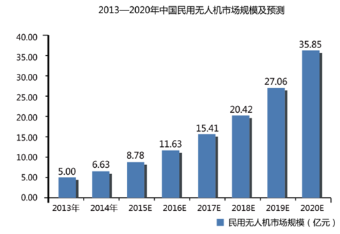 伴隨民用無人機產業鏈逐步完善,實現規?;a,大量專業級無人機整機產品推向市場,中國民用無人機銷售市場規模大幅增長,預計2018年,市場規模將達到110.9億元人民幣。