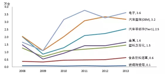 (圖表廣發機械:劉倩)機器人下游最終用戶可以按照行業分為:汽車工業,一般工業。一般工業中又可以分為食品飲料,石化,金屬加工,醫藥,3C,塑料,白家電等等。按照IFR的統計結果,汽車及零部件在機器人的銷售中占比最高。其次是電子、金屬、塑料石化等。2009-2013年全球工業機器人銷售量-按行業分