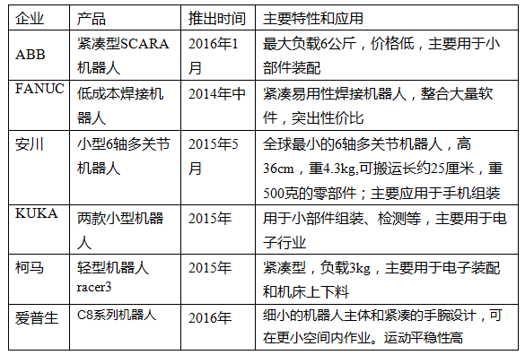 從上圖中可以看出,國外主要機器人品牌都在朝著緊湊、輕巧、靈活性更高的工業機器人方向出發。而中國的工業機器人企業也在3C電子市場持續發力。