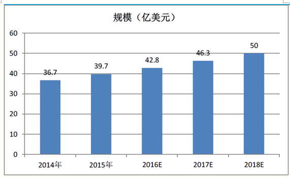 2014年全球機器視覺規模持續走高,達到36.7億美元。主要分布在北美、德國、英國、日本、中國等地區和國家,其中中國占到8.1%;預計到2018年全球市場規模將達到50億美元。