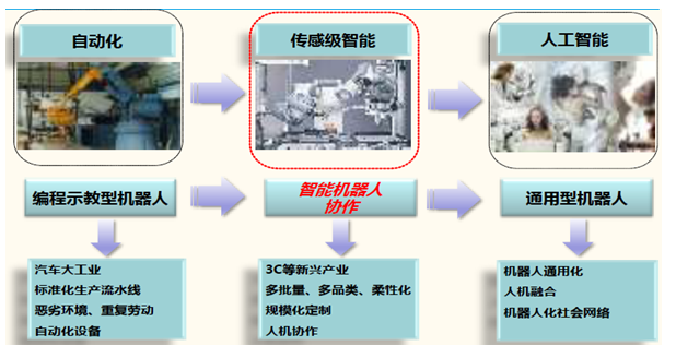 人機協作是工業機器人發展的新形態,把人的智能和機器人的高效率結合在一起,共同完成作業;簡單來說就是“人”直接用“手”來操作機器人。人機協作是機器人進化的必然選擇,特點是安全、易用、成本低,普通工人可以像使用電器一樣操作它。
