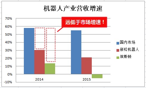 由于這十家企業有些企業成立時間并不長,具體業績也不是很清楚,但是像新松機器人、埃斯頓這些企業業績報表還是可以看得到的。2015年,這兩家企業在巨大的行業紅利前,業績增速表現并不如人意。