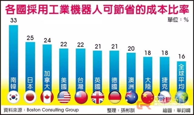 國(guó)際機(jī)器人聯(lián)合會(huì)(International Federation of Robotics,IFR)的2015年世界機(jī)器人統(tǒng)計(jì)報(bào)告,2014年全球機(jī)器人平均密度為每1萬(wàn)名員工中有66個(gè)機(jī)器人,在全球機(jī)器人密度排名方面,日本機(jī)器人密度高達(dá)314單位,僅落后于南韓的478單位。IFR估計(jì),全球工廠進(jìn)入2018年之后,將由近130萬(wàn)個(gè)工業(yè)機(jī)器人來(lái)提供服務(wù)。