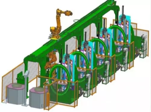 但隨著新型高強度、高韌性、超薄壁合金材料成型的要求,常規壓鑄生產出的零件不能通過熱處理來提高性能的劣勢也有所凸顯。而輕合金的重力鑄造由于可以根據產品成型的需要實現多種方式的澆注工藝,并能通過熱處理對合金材料進行強化,提高產品性能,是目前輕合金材料成型逐步推廣的方式之一,且該種方式設備布局簡單、靈活,投資相對較低。目前國內大多數輕合金的重力鑄造企業還處于全人工操作階段,但是國外的一些企業已形成利用工業機器人替代人工進行重力鑄造過程中的下芯、清模、澆注、取件、打磨等作業。