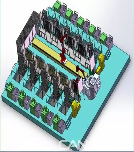 e.取件機器人放入傳送帶,檢測機器人對傳送來的零件進行檢測和X射線探傷,檢測機器人將不合格取出放置在不合格品區。從傳送帶流轉過來的合格產品通過取件機器人放置在熱處理區域。
