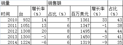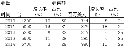 據統計,2012年全球個人/家用服務機器人銷量約為300萬臺,較2011年增長20%,銷售額為12.21億美元;2014年全球個人/家用服務機器人銷量約為470萬臺,較2013年增長17.50%,銷售額約為22.5億美元。