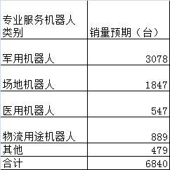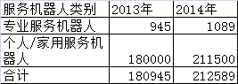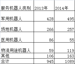2013年,中國專業服務機器人的銷量總共為945臺。其中,軍用機器人的銷量為428臺;場地機器人的銷量為266臺;醫用機器人的銷量為86臺;物流用途機器人的銷量為59臺;其他專業服務機器人的銷量為106臺。2014年,中國專業服務機器人的銷量總共為1089臺。其中,軍用機器人的銷量為495臺;場地機器人的銷量為257臺;醫用機器人的銷量為55臺;物流用途機器人的銷量為119臺;剩下其他專業服務機器人的銷量為163臺。