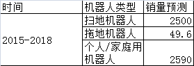 根據預測,2015-2018年,未來清潔機器人會首先打入家庭市場,掃地機器人的全球銷量將達到2500萬臺,拖地機器人的銷量會達到49.6萬臺。未來三年內,個人/家庭用服務機器人的全球銷量將高達2590萬臺,市場規模高達到122億美元,超過2014年市場規模的5倍。