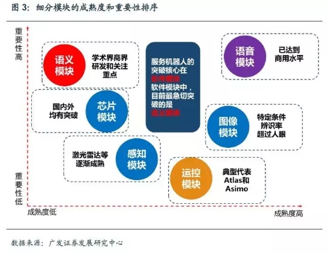 服務機器人的各個細分模塊中,語音模塊重要性和成熟度均最高,語義模塊是目前突破重點,運控模塊相對重要性最弱。服務機器人三大模塊可以繼續細分為語音模塊、語義模塊、圖像模塊、感知模塊、運控模塊、芯片模塊。重要性排序依次為:語音模塊、語義模塊、芯片模塊、圖像模塊、感知模塊、運控模塊。成熟度重要性排序依次為:語音模塊、圖像模塊、運控模塊、感知模塊、語義模塊、芯片模塊。