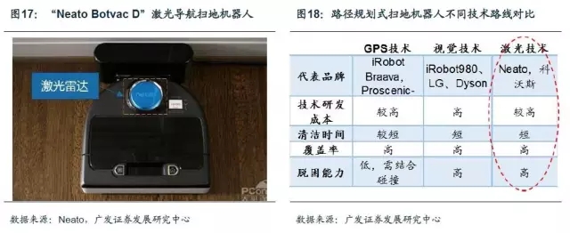 其中,由于掃地機器人面向消費市場,相同品牌下的激光導航掃地機器人和無任何導航方式的隨機碰撞式掃地機器人相比,價格一般貴出80%-150%,其普及過程與成本降低的進程高度相關。但路徑規劃式掃地機器人無論是從清潔效率或清潔質量上都比隨機碰撞式掃地機器人高出很多,是未來掃地機器人發展的方向。激光導航技術與同屬于路徑規劃類技術的GPS技術和視覺技術相比,激光導航技術在綜合能力上還是略占上風。