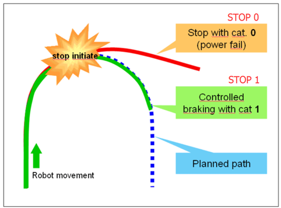 停止類別1,又稱Stop 1:控制器控制電機減速到停止后,再切斷動力電源。這是一種受控的停止方式,機器人基本上會按照預先定義的軌跡完成減速;在最新的機器人系統中,由于安全控制器技術的使用,急停按鈕觸發的停止大多數屬于這種停止(手動模式下除外),以保護剎車系統。