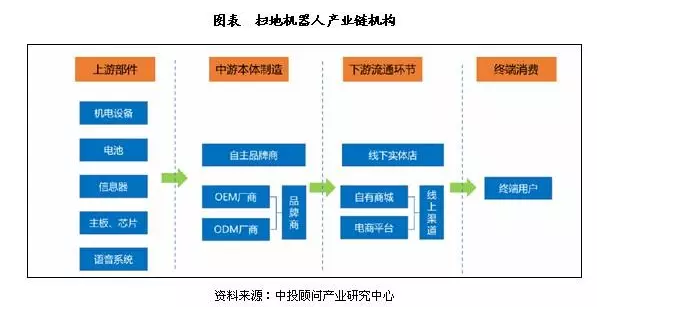 從我國掃地機器人目前的產業鏈構成來看,上游部件主要是機電設備、電池、主板芯片等零部件行業,中游本體制造中,包括兩類企業,一類是自己擁有獨立品牌的自主品牌商,另一類是給國外品牌做ODEM和OEM代工的企業。下游流通環節中,主要是線下實體店+線上渠道為主,并且線上渠道目前有超越線下渠道的趨勢。目前產業鏈的核心,仍然掌握在中游的本體制造商手中,尤其是具備自主品牌的本體制造商,享有的議價能力更強。