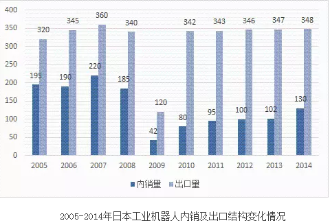 2005-2014年日本工業(yè)機(jī)器人內(nèi)銷及出口結(jié)構(gòu)變化情況