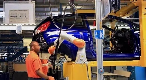 比如福特與庫(kù)卡聯(lián)手打造的協(xié)作機(jī)器人。這臺(tái)協(xié)作機(jī)器人是福特與庫(kù)卡花了兩年時(shí)間暗地里打造的,于上個(gè)月在福特德國(guó)科隆的Fiesta工廠揭開(kāi)了面紗。在工作中,該協(xié)作機(jī)器人能夠幫助工人安裝汽車(chē)減震器,并確保減震器放置的準(zhǔn)確性、快速性,從而減少了工人的負(fù)擔(dān)。不過(guò),該協(xié)作機(jī)器人在外形上與LBRiiwa擁有近乎100%的相似度,應(yīng)該是一款“定制版”LBRiiwa。