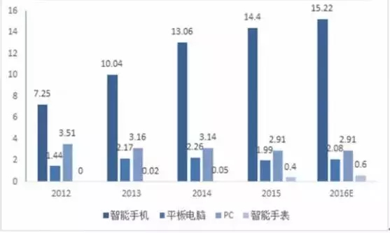 全球消費(fèi)電子設(shè)備出貨量(單位:億部)