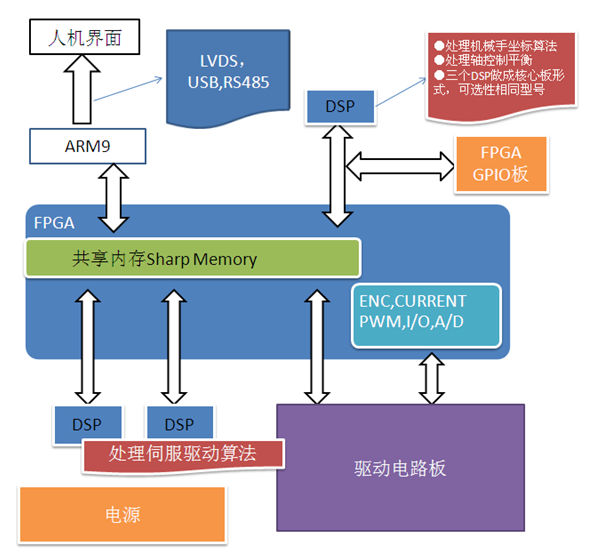驅控一體系統采用了分布式CPU架構,使得硬件各盡其職。分布式CPU架構從實時角度上來說,一個CPU干一件事就是一種硬實時,保證了方案的可靠性。此外它還有效地利用了嵌入式CPU的特性來發揮系統的高效性,如FPGA適合做高頻的邏輯處理,ARM適合做人機交互,DSP適合做算法運算等,各自發揮各自的特長,從而保證整體的性能更優。