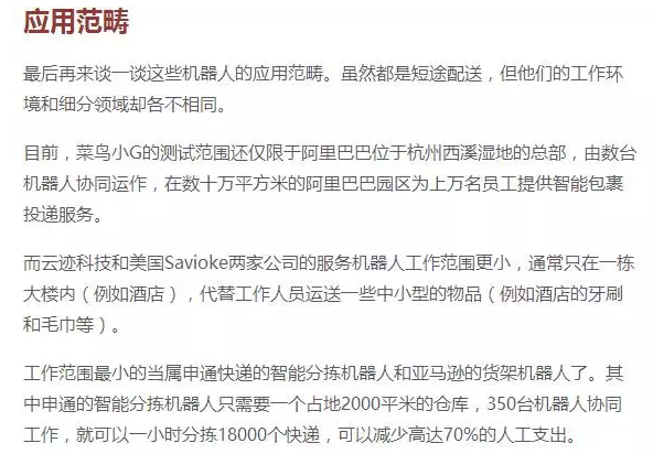在豐富多樣的應(yīng)用機(jī)器人領(lǐng)域,短途配送無疑是其中一個(gè)重要的分支。這一類的機(jī)器人通常不需要具備靈巧的運(yùn)動(dòng)能力,也不需要與人類進(jìn)行復(fù)雜的語言或者表情溝通。他們只在一個(gè)預(yù)先設(shè)定好的小片區(qū)域內(nèi),通過智能導(dǎo)航和路線規(guī)劃,自主地為用戶提供中小型物品的配送服務(wù)。除了上述阿里菜鳥的小G和京東無人配送車之外,同類型的還有申通快遞的智能分揀機(jī)器人,亞馬遜的貨架機(jī)器人,云跡科技、美國Savioke公司的服務(wù)機(jī)器人等。