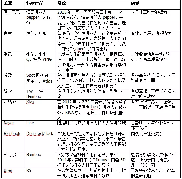表:十大互聯(lián)網(wǎng)巨頭機(jī)器人布局情況