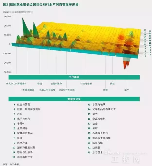 企業將減少對從事簡單、重復性工作的人員需求,因為它們可以利用機器來從事這些工作并實現標準化操作。此類工作崗位的減少將主要源于機器人在生產車間的應用以及常規工作實現計算機化操作。生產類崗位將減少12萬(相當于4%),質量管理類崗位將減少2萬(相當于8%),維護類崗位將減少多達1萬(相當于7%)。常規的認知型工作也將會受到影響,比如,2萬多個生產計劃崗位將被取消。到2025年以后,頂替勞動力的機器人和人工智能將加速發展。