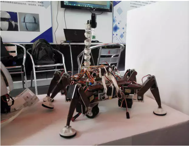 這臺六足四輪移動機器人同樣來自哈爾濱工業大學深圳研究院,是一臺可實現大范圍探測的移動機器人。其搭載的移動平臺為輪腿式機構,當地面凹凸不平或有臺階時,可以采用六足進行運動,在平臺的路面,則可以采用輪式機構進行快速移動,非常靈活。