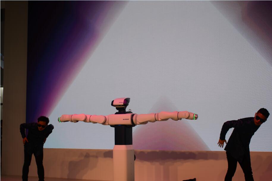 圖為雙臂協作機器人正式亮相并與工作人員帶來機械舞表演