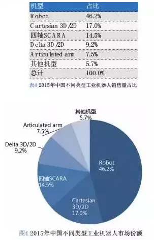 從機型來看,2015年中國所銷售的工業機器人中,以Robot和Cartesian3D/2D為主,Robot銷售量占比達到46.2%,Cartesian3D/2D銷售量占比達到17.0%,二者銷售量之和達到總體銷售量的63.2%。Robot銷售量最大的主要原因在于其主要應用在汽車領域,汽車領域是機器人應用最為成熟的領域。Cartesian3D/2D主要應用在塑料橡膠和金屬加工等領域,加之較低的價格,Cartesian3D/2D成為市場份額僅次于Robot的機型。