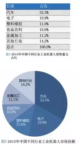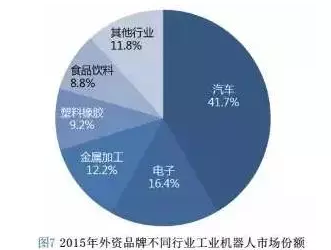 相關調查報告顯示,2015年中國市場外資品牌工業機器人主要銷往汽車行業。汽車行業的銷售量占比超40%主要有兩方面原因,一方面,汽車行業自動化要求更高,對工業機器人的需求更高更穩定,因此,外資品牌多采取以汽車行業為銷售重心,逐漸向其他行業擴散的銷售策略;另一方面,國內市場規模較大的汽車廠商以外資廠商為主,通常來說,它們會與工業機器人外資廠商保持長期合作關系,雙方供貨關系較為穩定。