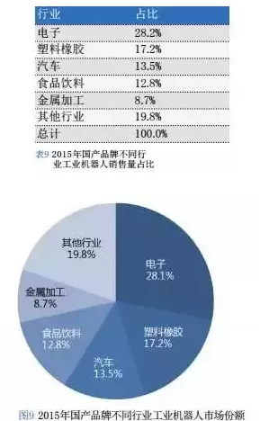 相關研究報告顯示,2015年中國市場國產品牌工業機器人的應用行業比較分散,相較而言,電子行業和塑料橡膠行業是主要應用行業,與汽車行業和金屬加工行業相比,電子行業和塑料橡膠行業對機器人性能和穩定性等方面的要求相對較低,兩個行業所應用的機器人對Cartesian3D/2D、Delta3D/2D以及Articulatedarm需求較高,而本土廠商也有足夠能力生產這三種機型,因此,國產品牌工業機器人多數銷往電子行業和塑料橡膠行業。