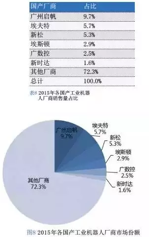 對比不同國內廠商2015年的銷售情況,市場表現較好的國內廠商分別是廣州啟帆、埃夫特、新松、埃斯頓、廣數控和新時達,相較其他本土廠商,這五家廠商起步較早,目前都已具備一定規模和技術實力。