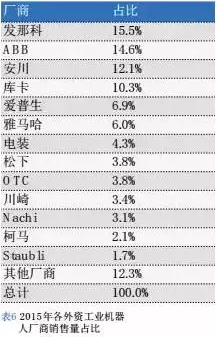 對比不同外資廠商2015年的銷售情況,外資廠商仍以四大家族為首,即發那科、ABB、安川和庫卡。四家廠商合計銷售占外資品牌總銷售量的比例超過50%,發那科銷售量最高,占比達到15.5%。