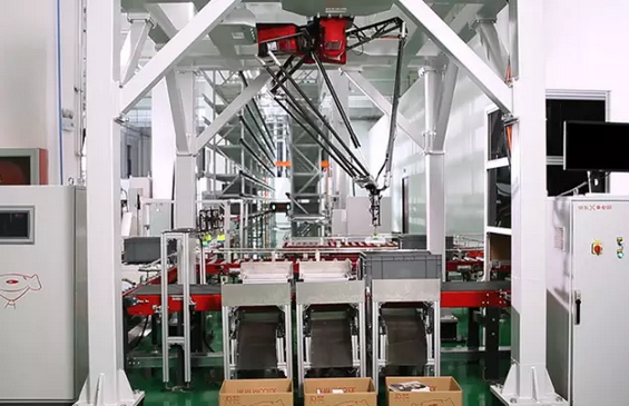 在六軸機(jī)器人分揀之前,貨物會先經(jīng)過內(nèi)置有攝像頭的“黑匣子”,這個黑匣子用來識別貨物,起到驗(yàn)貨的作用。接下來,分揀機(jī)器人會將貨物從貨箱中取出,分到小件打包的通道。這個delta機(jī)器人每小時可以完成3600次的分揀?! ?/p>