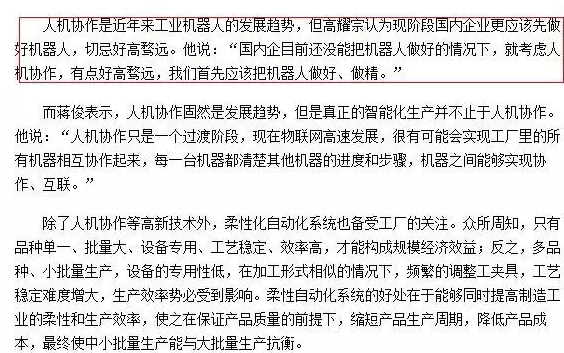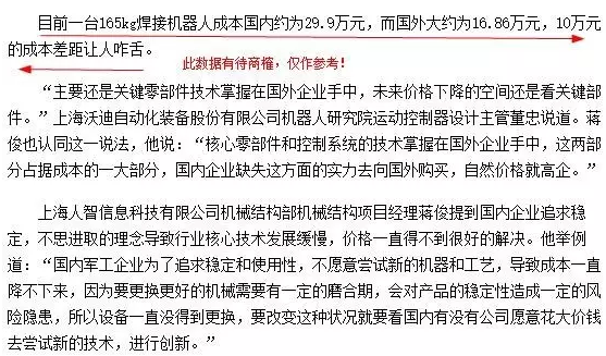 浙江碩實機器有限公司電氣工程師高耀宗也認同國內企業的經營理念導致價格高居不下,他說道:“國內80%的企業不愿意進行大量的技術改進投資,他更愿意去投資實現一些想要的簡單功能,更加注重實用性,機器人的質量并不在乎,做不到精益求精,這對技術發展不利,未來假如國內的機器人精度一直提不上去,國內機器的品質太低的話,即使價格下降低也無法應用。”