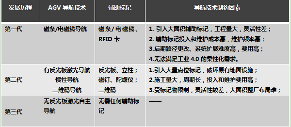1953年第一臺AGV誕生,當時采用磁帶和電磁線的線性標記輔助導引技術。在上個世紀80年代后期,經過30多年的發展,才出現基于點位輔助標記的激光和慣性導航方式,用點位標記代替線性標記。直到2013年艾吉威推出無反射板激光自主導航技術后,徹底革新了AGV導航方式必須借助外界輔助標記的歷史。