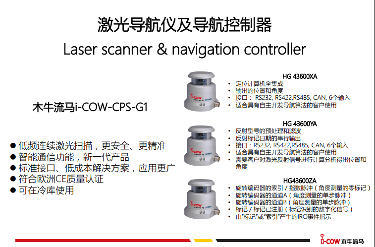 目前,木牛流馬向中國市場同時(shí)提供三款A(yù)GV用激光導(dǎo)航儀,分別是HG 43600XA、HG 43600YA和HG43600ZA。木牛流馬的AGV用激光導(dǎo)航儀雖然也需要按照反射標(biāo)志,但是技術(shù)上和目前市場的NDC 、 P+F和SICK產(chǎn)品有著顯著的技術(shù)差異,角度精度提高20倍,是目前市場上唯一一款可以直接在零下25度的環(huán)境中使用的激光導(dǎo)航儀。