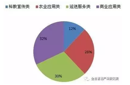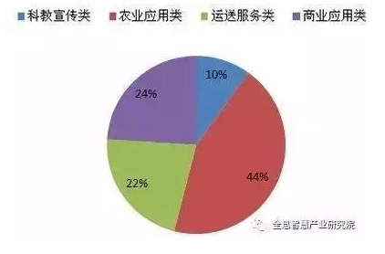 2016年,全球農業(yè)應用類機器人市場規(guī)模占比最高,達44%,商業(yè)應用類和運送服務類占比相近,分別為24%和22%,科教宣傳類占比最低僅10%。2016年全球智能專業(yè)服務機器人市場規(guī)模占比