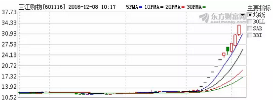11月18日,阿里巴巴集團子公司阿里巴巴澤泰擬通過協議受讓、認購定增股票、認購可交換債等方式收購三江購物股份。收購完成后,阿里巴巴澤泰將持股32%,而若阿里巴巴澤泰將可交換債全部轉換為股份,則持股增至35%,為第二大股東。從11月21日截至今日,三江購物已經連著11個漲停了。