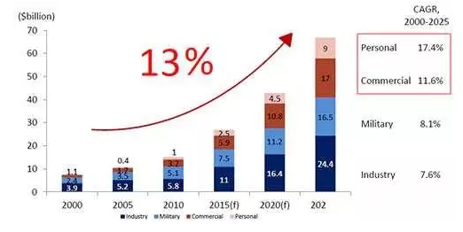 圖1 2000~2025年全球各應(yīng)用領(lǐng)域機(jī)器人產(chǎn)業(yè)規(guī)模
