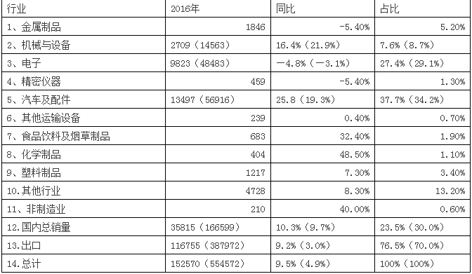 以行業分類來看,汽車及其配件是日本在2016年綜合變化比較大的領域,銷量占比為37.7%,同比增長25.8個百分點,銷售額占比為34.2%,同比增長19.3個百分點,無疑成為過去一年機器人應用行業的綜合冠軍。另外,電子行業以綜合應用實力排在第二位,機器人銷量和銷售額占比分別為27.4%和29.1%,同比下降了4.8個百分點。
