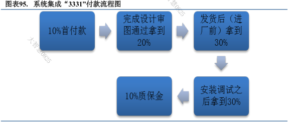 系統集成的付款通常采用“3331”的方式,即圖紙通過審核后拿到 30%,發貨后拿到 30%,安裝調試完畢拿到 30%,最后剩 10%的質保金。按照這樣一個付款流程,系統集成商通常需要墊資。