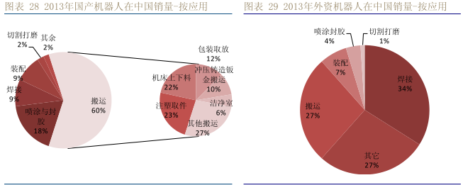 對比國產(chǎn)機(jī)器人及外資機(jī)器人在不同應(yīng)用中的機(jī)器人銷量,可以看到國產(chǎn)機(jī)器人在搬運應(yīng)用中的占比奇高。這主要是由于國產(chǎn)機(jī)器人以中低端機(jī)器人為主,而中低端機(jī)器人又以搬運應(yīng)用為主。