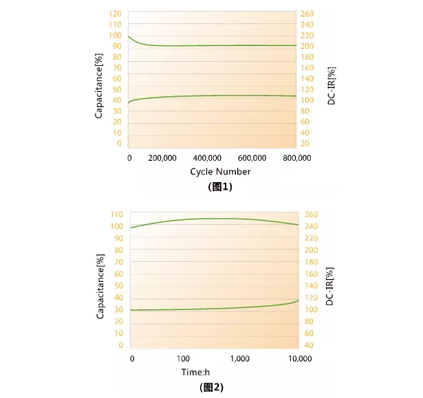 鋰離子電容能夠在電壓高于超級電容器的環境下工作并且具有良好的高溫穩定性。這一特點得益于采用預摻雜過程這一設計來降低負極的電勢來抑制正極電勢的上升。與此同時,這種抑制負極的過程,即使經過循環充放電后依舊耐用。(圖1/圖2)