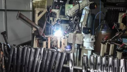 圖中的焊接機器人一次可以焊接兩根前叉,每一次都發出強烈的火光,更勝手工焊接。