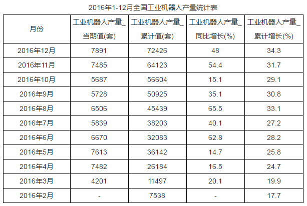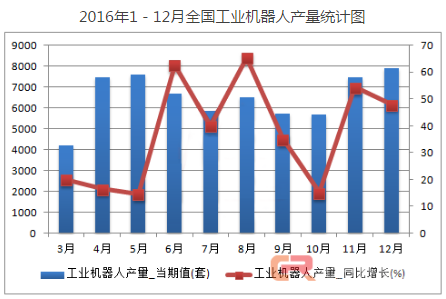 智研咨詢數(shù)據(jù)顯示:2016年12月中國工業(yè)機(jī)器人產(chǎn)量為7891套,同比增長(zhǎng)48%。2016年1-12月止累計(jì)中國工業(yè)機(jī)器人產(chǎn)量72426套,同比增長(zhǎng)34.3%。2016年1-12月全國工業(yè)機(jī)器人產(chǎn)量數(shù)據(jù)表如下表所示: