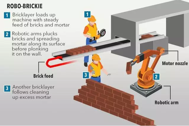 由于是半自動的,因此整套系統(tǒng)運作時還需要兩位工人幫忙,一位負(fù)責(zé)將磚塊放上傳送帶,隨后由噴嘴抹上水泥的磚塊會被機械臂拿起并砌在相應(yīng)部位,第二位工人則負(fù)責(zé)抹掉墻上多余的水泥。